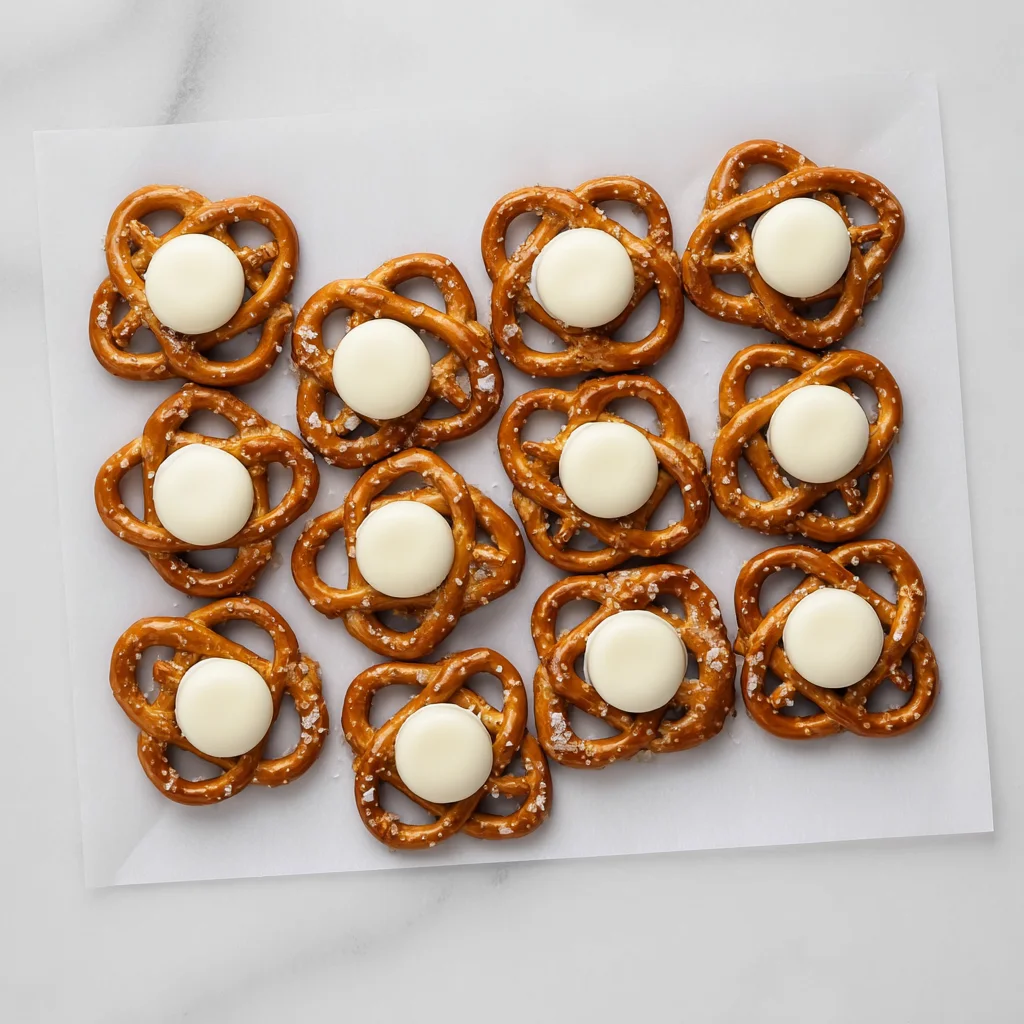 - Assemble the Base: Lay your pretzel snaps out in a single layer on a microwave-safe plate. Paper plates are excellent for this because they don’t hold onto excess heat. Place one white candy melt exactly in the center of each pretzel.