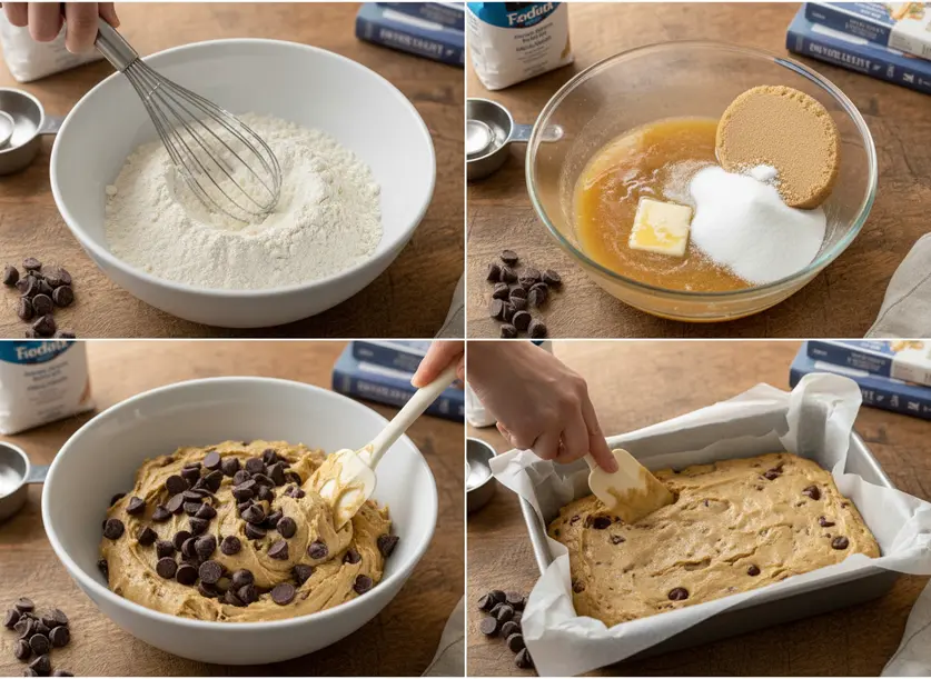- Gradually add the dry flour mixture to the wet ingredients, mixing on low speed or by hand until just combined. Be careful not to overmix the dough, as this can lead to tough bars.