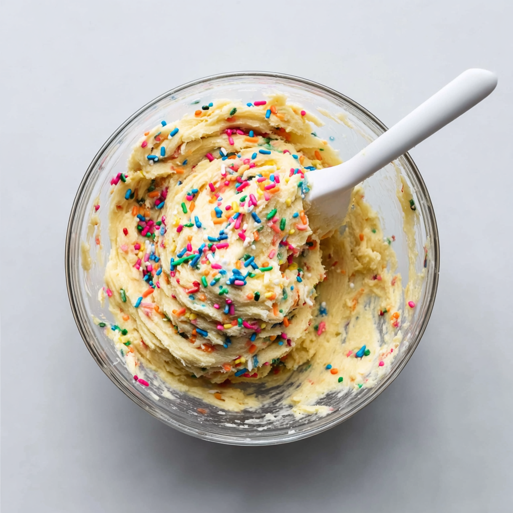 - Fold in the Sprinkles: Once a cohesive dough has formed, gently fold in the rainbow sprinkles. Doing this last ensures the colors don’t bleed into the dough, keeping it looking bright and festive.