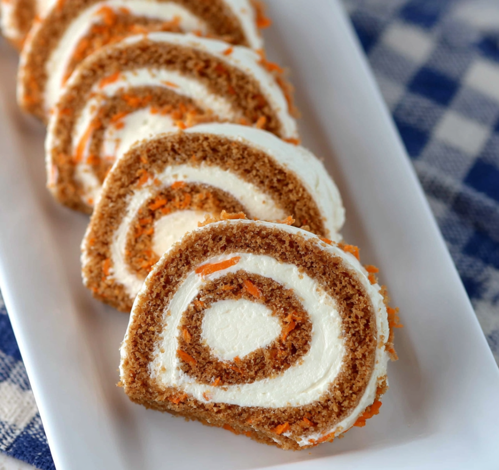 A moist, spiced carrot cake roll filled with velvety cream cheese frosting. This elegant dessert is easier to make than it looks and is perfect for spring gatherings or Easter celebrations.