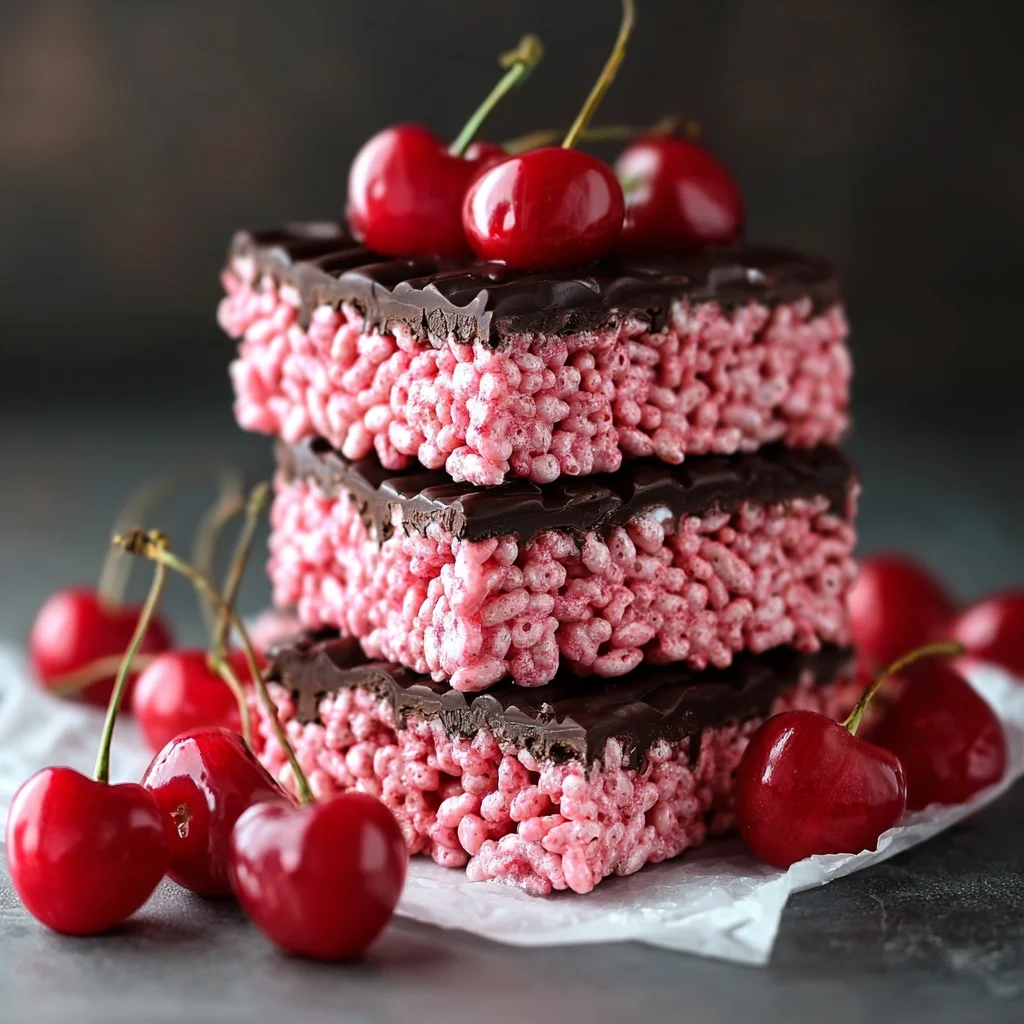 A delicious and vibrant no-bake dessert that combines the nostalgic crunch of Rice Krispies with the sweet, fruity punch of cherry gelatin and a rich chocolate finish.