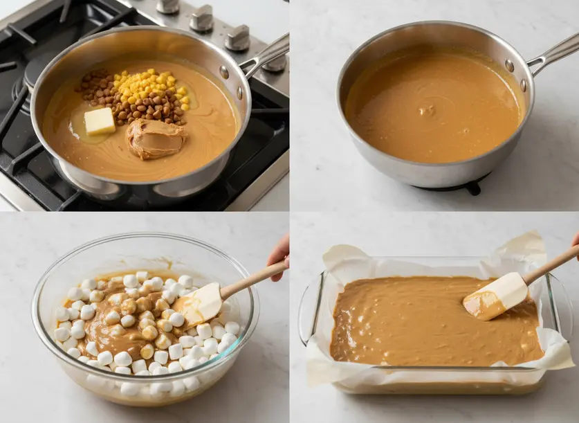 - Melt the base: In a medium to large saucepan, combine the butter, butterscotch chips, and peanut butter. Place the saucepan over medium-low heat.