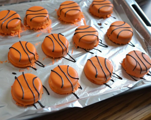 • Let them chill for 15-20 minutes, or until the orange candy melt coating is completely set and firm to the touch. This ensures a solid base for your basketball lines.