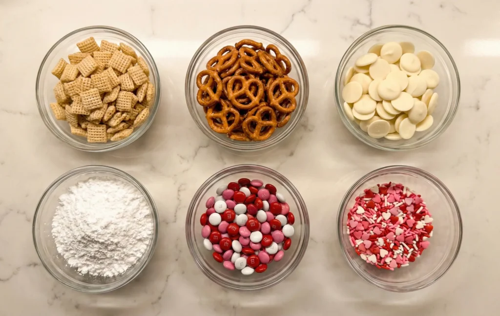 An irresistible, easy-to-make no-bake snack mix perfect for Valentine’s Day, featuring white chocolate-coated Chex cereal, mini pretzels, festive M&Ms, and a dusting of powdered sugar. Perfect for family gatherings and sweet cravings!