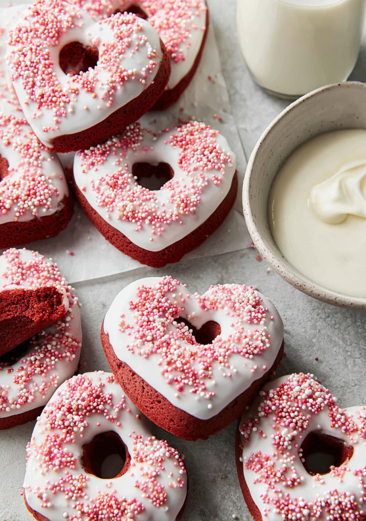 These Red Velvet Donuts are incredibly versatile for holiday planning. For Valentine’s Day, top the cream cheese glaze with heart-shaped sprinkles or a drizzle of melted white chocolate. For Christmas, a few crushed candy canes on top of the white glaze create a beautiful “Red and White” festive look. You can even turn these into “Spider-Man” themed donuts for a birthday party by using blue sprinkles. If you want an extra layer of decadence, try stuffing the centers with a little extra cream cheese frosting using a Bismarck tip, or adding chocolate chips directly into the batter for a “Double Chocolate Red Velvet” experience.