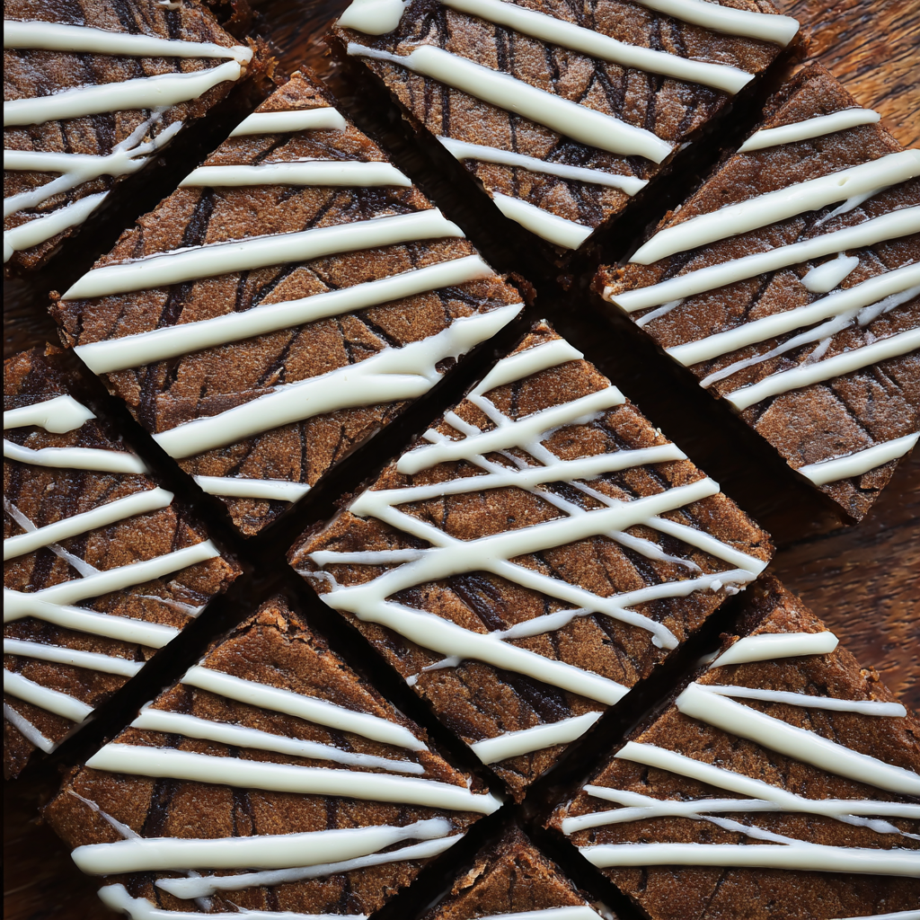 These Gingerbread Blondies are thick, fudgy dessert bars packed with warm spices and rich molasses, finished with a sweet white chocolate drizzle. They combine classic gingerbread flavor with the chewy texture of a blondie for an easy, festive holiday treat.