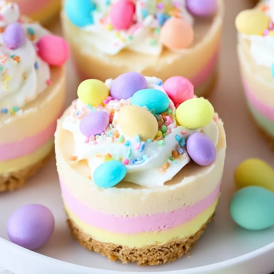 Serve these cheesecakes chilled on a white porcelain platter to make the colors “pop.” Just before serving, top each one with a generous swirl of stabilized whipped cream. For a festive touch, add a few malted milk candy eggs or a dusting of rainbow nonpareils. These pair beautifully with a crisp glass of Moscato or a light Earl Grey tea, which cuts through the richness of the cream cheese.