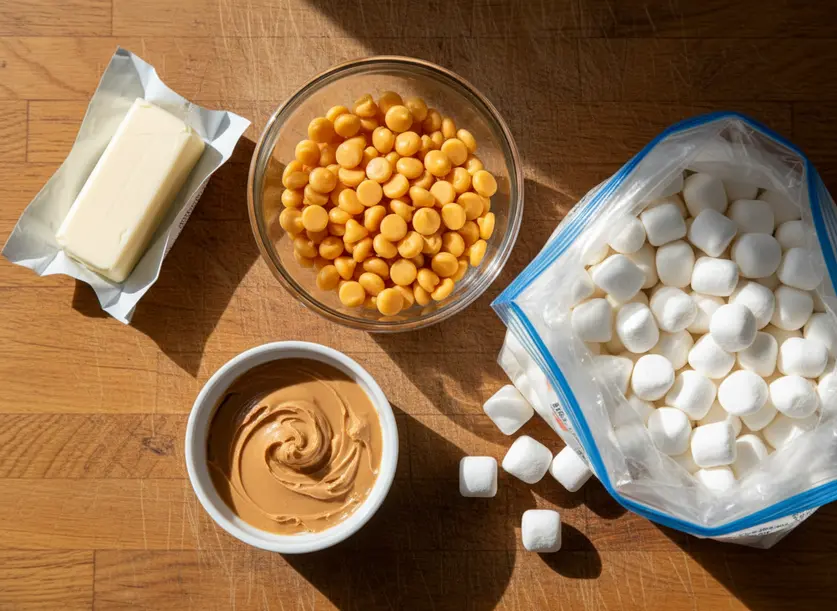 Gathering your ingredients for these delightful Peanut Butter Butterscotch Marshmallow Squares is half the battle won, and it’s a simple one! You’ll start with half a cup of butter. I usually use salted butter because I love that hint of saltiness against the sweet, but unsalted works just as well. Just add a tiny pinch of salt to your mixture if you go with unsalted.