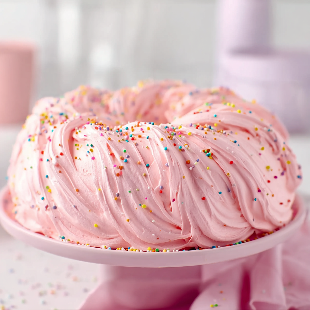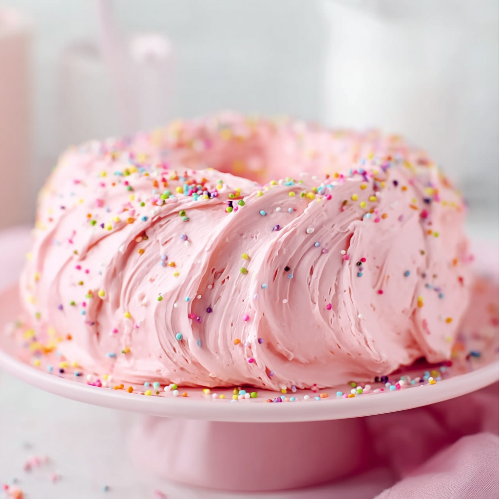Serve this Pink Angel Food Cake on a glass pedestal to show off its height and color. It pairs beautifully with a side of fresh macerated strawberries or raspberries, which cut through the sweetness of the marshmallow frosting. For a tea party, serve thin slices alongside a pot of Earl Grey or a floral herbal tea. If you’re serving this at a birthday party, don’t forget the rainbow nonpareil sprinkles—they add a nostalgic crunch and a pop of color that children and adults alike will find irresistible.