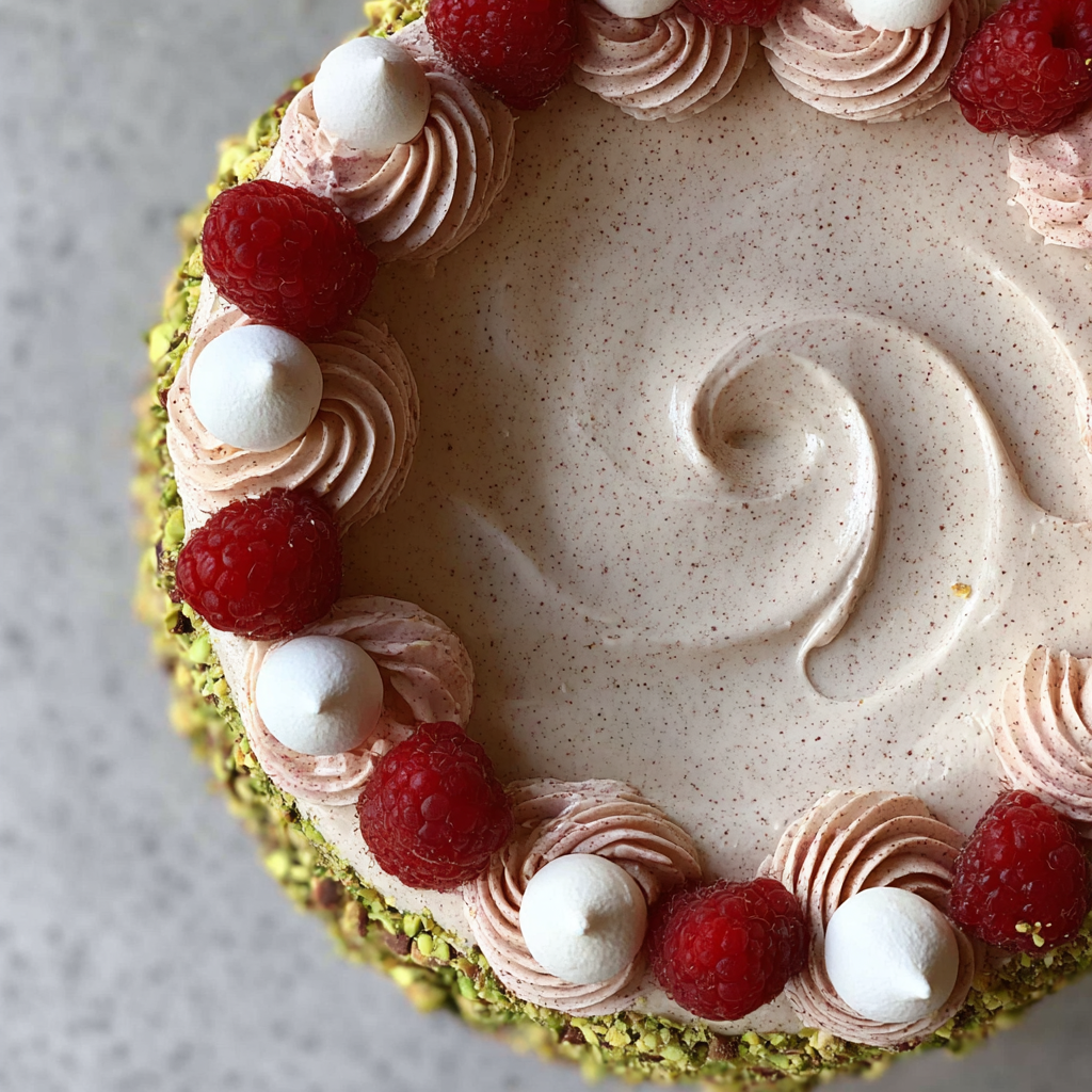 - Final decoration: Cover the cake completely with the remaining raspberry buttercream, smoothing with a bench scraper or offset spatula. Press chopped pistachios onto the sides of the cake.