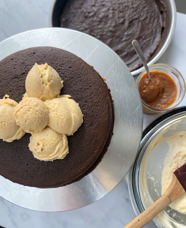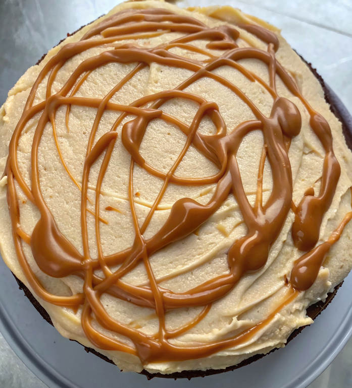 10. Assemble: Layer cake with ~300g buttercream per layer, drizzling caramel between layers. Coat sides lightly or fully, and drizzle top with caramel.