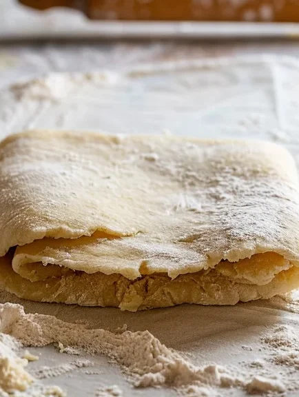 6. On a floured surface, roll into a 9×13 rectangle, fold in quarters to create layers, and pat to 1 1/4 inch thickness.
